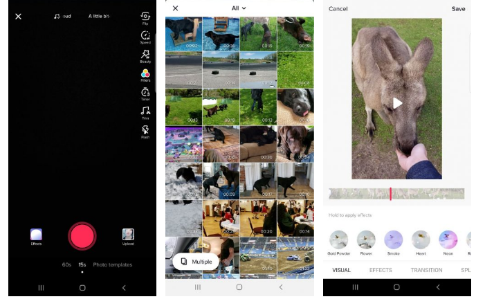 ينقلك هذا إلى معرض هاتفك حيث يمكنك اختيار الفيديو الذي تريد تحميله. لتحميل أكثر من فيديو واحد، حدد متعدد “Multiple”. يمكنك بعد ذلك المتابعة لتحرير طول الفيديو، بالإضافة إلى إضافة نص ومرشحات.